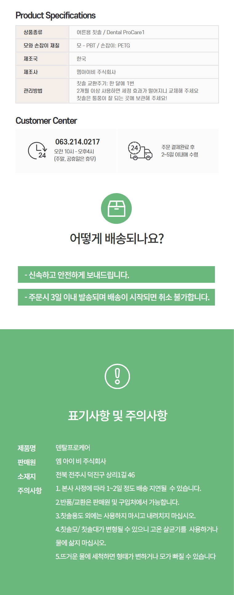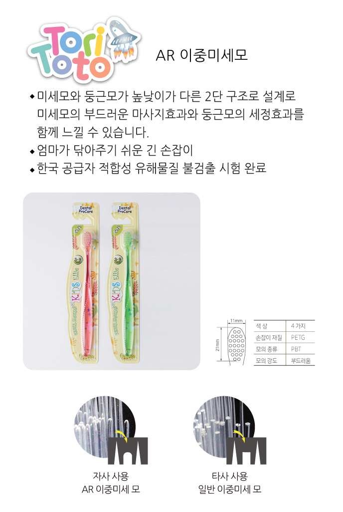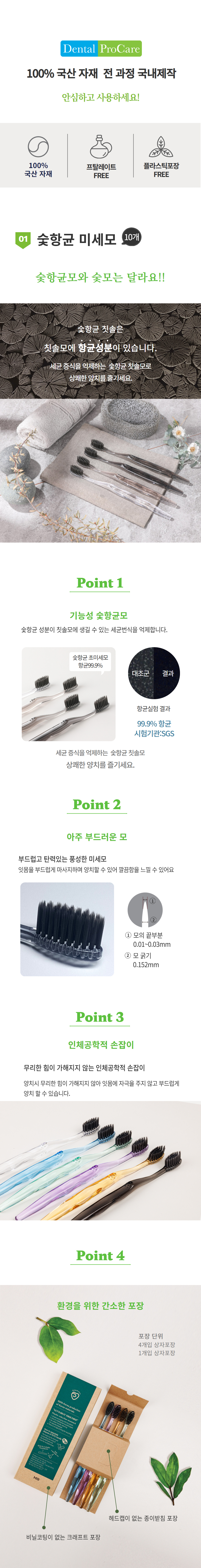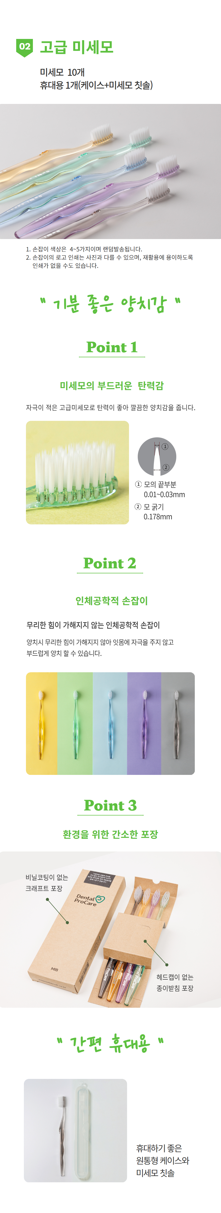 100% 고급 국산 자재로 전 과정 국내 생산 모든 모의 끝부분이 두께 0.01~0.03mm로 부드럽고 탄력이 좋은 고급 미세모 칫솔 환경을 위한 플라스틱 프리포장